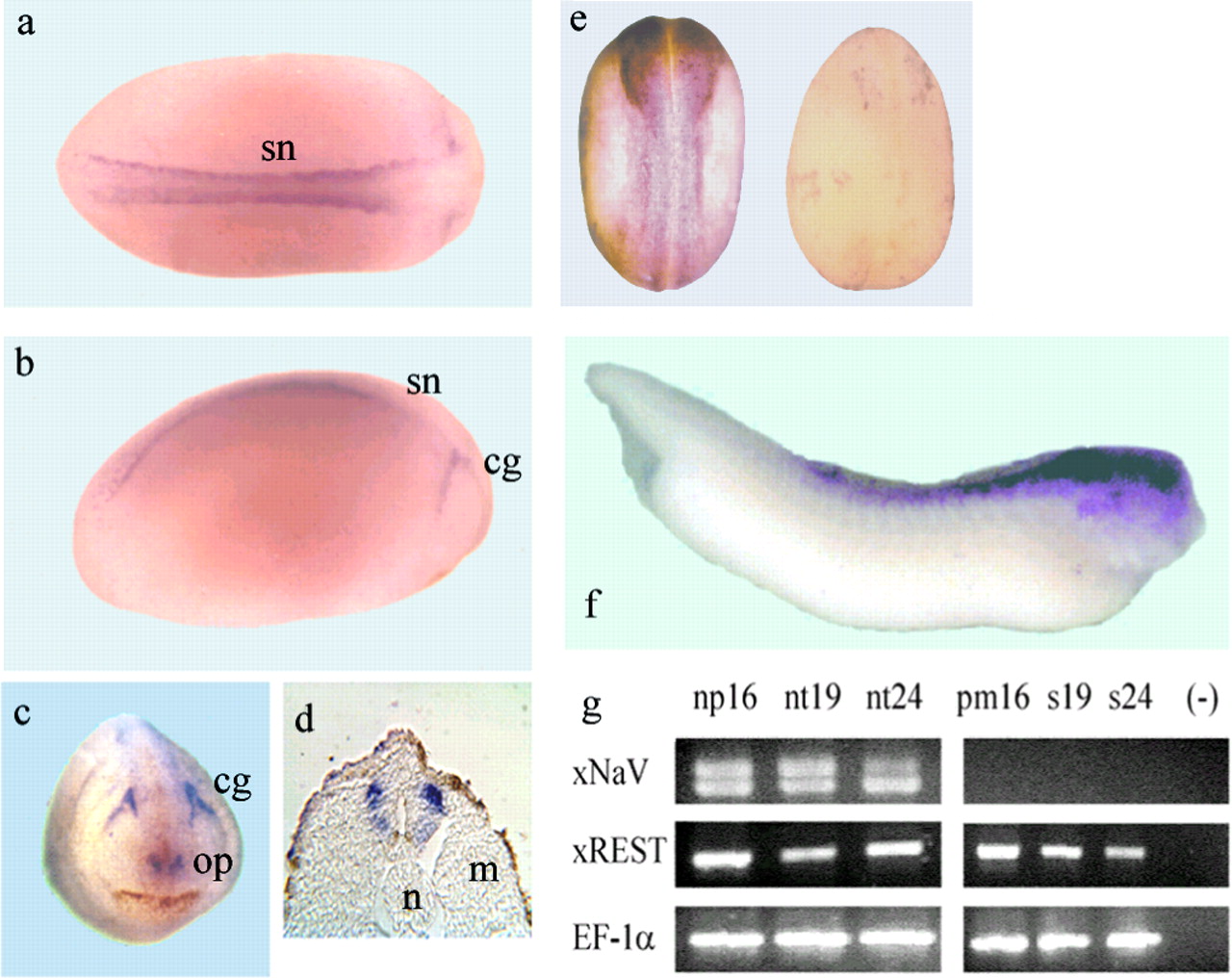 NaV1.2 and REST/NRSF are expressed in neural tissues during development of X. laevis.aâd, ISH for xNaV1.2: expression is restricted to primary spinal neurons (sn), cranial ganglia primordia (cg), and olfactory placodes (op). In a section of a stage 18 embryo, xNaV 1.2 expression is observed in the lateral and ventral regions of the neural tube. a, Dorsal view, stage 18; b, lateral view, stage 18;c, anterior view, stage 24; d, central transversal section, stage 18; n, notochord;m, presomitic mesoderm; e,left, ISH showing diffuse expression of REST during neurulation (stage 18), including neural folds; right, a sense REST probe does not produce significant labeling in a stage 18 embryo; f, at stage 35, REST/NRSF expression is stronger in the anterior neural tissue; g, RT-PCR showing the coexpression of xNaV1.2 and REST/NRSF in dissected tissues at the stages annotated; np, neural plate; nt, neural tube; pm, presomitic mesoderm; s, somites. The constitutively expressed transcript EF1α is shown as a control. Image published in: Armisén R et al. (2002) Copyright © 2002. OA ARTICLE, images redisplayed under a Creative Commons license.