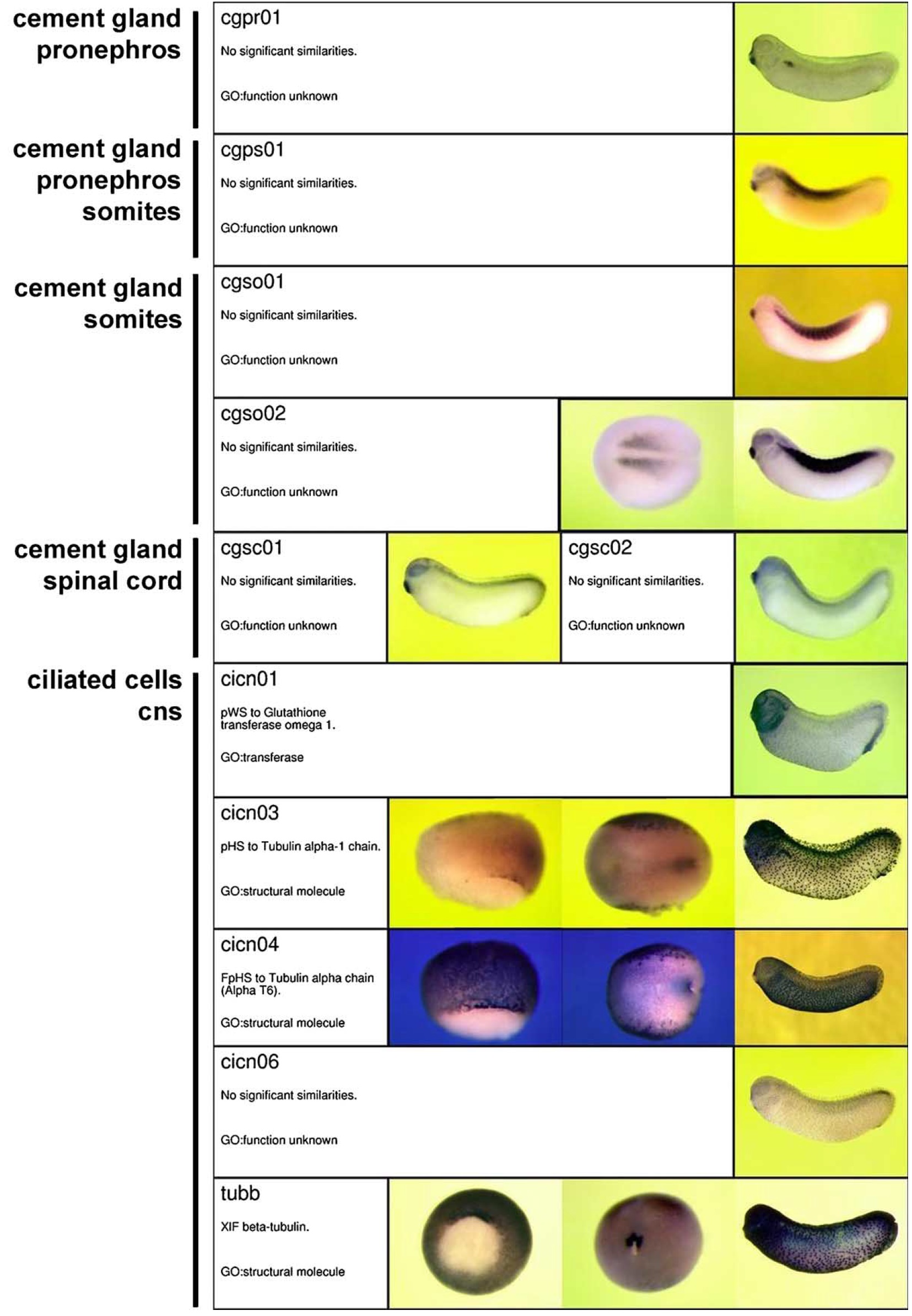 name or description of the best hit, and GO molecular function classification are indicated. Gene order is alphabetical. The absence of pictures showing early