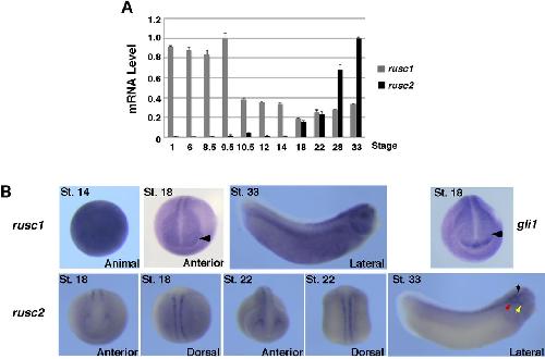 development. The expression level of rusc1 and rusc2 was normalized to that of odc. Data are shown as mean±s.d. (B) Whole-mount in situ hybridization showing
