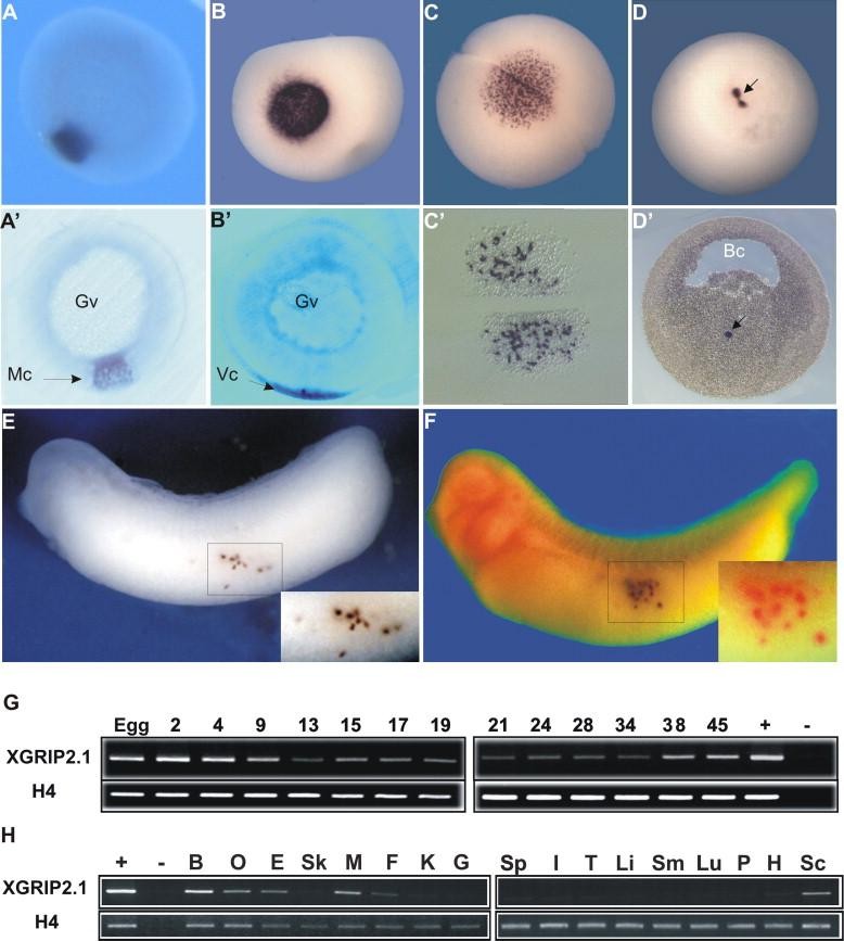 Fig. 1. Analysis of XGRIP2.1 expression by whole mount in situ hybridization and RT-PCR. (AâF) The localization of XGRIP2.1 mRNA in Xenopus oocytes and embryos was analyzed by whole mount in situ hybridization, followed by vibratome sectioning (Aâ²âDâ²). In stage I oocytes, XGRIP2.1 mRNA was detected in the mitochondrial cloud (A, Aâ²) and at early stage III at the tip of the vegetal cortex (B, Bâ²). At the 2-cell stage of embryogenesis, XGRIP2.1 mRNA is enriched in granular patches of germ plasm at the vegetal pole (C, Câ², vegetal pole view). At gastrula stage, the transcript was detected in isolated cells within the endoderm (D, blastoporus view, arrow in panel Dâ²). At tailbud stage, XGRIP2.1 is specific to the migrating germ cells (E, lateral view of the embryo with the head to the left). XGRIP2.1 and Xpat RNAs colocalize in migrating PGCs at tailbud stage of embryogenesis. Embryos were sequentially stained for XGRIP2.1 (blue) and Xpat (red, magnified view in the inset, the first staining of the same embryo) (F, lateral view of the embryo with the head to the left). RT-PCR analysis of the temporal expression during embryogenesis (G) and tissue-specific expression of XGRIP2.1 (H). Total RNA for RT-PCR was prepared from embryos or from adult tissues. Abbreviations: Gvâgerminal vesicle, Mcâmitochondrial cloud, Vcâvegetal cortex, Bcâblastocoel, Bâbrain, Oâovary, Eâeye, Skâskin, Mâmuscle, Fâfat, Kâkidney, Gâgall bladder, Spâspleen, Iâintestine, Tâtestes, Liâliver, Smâstomach, Luâlung, Pâpancreas, Hâheart, Scâspinal cord. Image published in: Tarbashevich K et al. (2007) Copyright © 2007. Image reproduced with permission of the Publisher, Elsevier B. V.