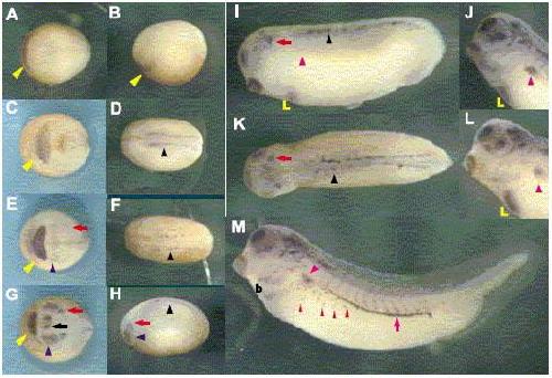 Fig. 3. Id4 mRNA expression pattern in the early embryo. (A, C, E, G) Dorso-anterior views at stage 13, 15, 17, and 19. (B) Lateral view stage 13. (D, F) Dorsal view stage 15 and 17. (H) Lateral view stage 19. (I, K) Lateral and dorsal views, stage 24. (J, L) Lateral view of head staining, stages 32 and 34. (M) Lateral view stage 37. Embryos show staining in the anterior region of the embryo corresponding to the cement gland (yellow arrowhead). By stage 19, expression is also obvious bilaterally in the olfactory placode (black arrow), eye primordia (blue arrowhead), and in the trigeminal ganglia (red arrow). Dorsal and lateral views show expression in the RohonâBeard neurons (black arrowhead). In later stages, Id4 is expressed in the liver (marked with a yellow L), branchial arches (black b), kidney (red arrowhead marks tubules in J, L, and M, red arrow marks duct in M), and in migrating melanophores (small red arrowheads in M). Image published in: Liu KJ and Harland RM (2003) Copyright © 2003. Image reproduced with permission of the Publisher, Elsevier B. V.