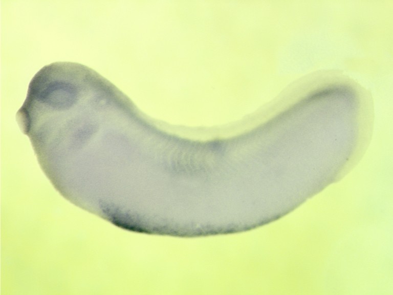 loc100497404 (midline-1-like) gene expression in Xenopus laevis embryo via in situ hybridization, NF stage 29 & 30, lateral view, anterior left. Copyright © CNRS UMR 8080, Nicolas Pollet Image published in: AXELDB Database, AxelDB (Image Pages)