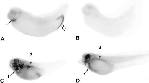 Figure 2. Stromelysin-3 (ST3) and collagenase-4 (Col4) have distinct spatiotemporal expression profiles during embryogenesis. Whole-mount in situ localization of ST3 (A,C) and Col4 (B,D) mRNA showed very restricted expression patterns during development at stages 32 (A,B) and 45 (C,D). ST3 was largely restricted to the branchial arches (A, single arrow) and dorsal posterior endoderm (A, double arrow) at stage 32 and to structures in the thorax (C, t) and the dorsal anterior axis (C, d) at stage 45. Col4 could not be detected at stage 32 (B) and was only detectable at approximately stage 45 where it was also present in the thorax (D, t) and the dorsal anterior axis (D, d), although in a somewhat different pattern compared with ST3. Image published in: Damjanovski S et al. (2001) Copyright © 2001. Image reproduced with permission of the Publisher, John Wiley & Sons.