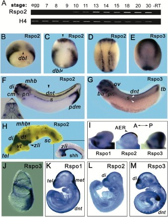 Figure 2. Expression Analysis of Xenopus and Mouse R-spondins(A) Rspo2 expression during Xenopus development at the indicated embryonic stages analyzed by RT-PCR. Histone H4 was used for normalization. âRT, minus reverse transcription control.(BâH) Xenopus whole-mount in situ hybridizations of the indicated genes.(B) Stage 11 embryo, dorso-vegetal view; dbl, dorsal blastoporal lip.(C) Stage 12 embryo, dorsal view with anterior up. An anterior neural expression domain is indicated by arrowhead.(D) Stage 15 embryo, dorsal view with anterior up.(E) Stage 14 embryo, dorsal view with anterior up.(F and G) Tailbud stage embryos; ba, branchial arches; cm, cranial musculature; di, diencephalon; dnt, dorsal neural tube; mhb, midbrain-hindbrain boundary; ov, otic vesicle; pn, pronephros; pdm, proctodeum; s, somites; tb, tailbud mesoderm. Inset in (F) shows a transverse section at the level indicated by arrowhead, showing expression in dorsal neural tube and in the dorsal- and ventral-most parts of the somites.(H) Dissected Xenopus tadpole brain (lateral view) showing expression in diencephalons (di) and zona limitans intrathalamica (zli), where sonic hedgehog is expressed (inset). dt, vt, dorsal and ventral thalamus, respectively; sc, spinal cord; tel, telencephalon.(IâM) Mouse whole-mount in situ hybridizations of the indicated genes.(I) Limb buds of day 12.5 mouse embryos. AER, apical ectodermal ridge.(J) Day 7.5 mouse embryo showing Rspo3 expression in the primitive streak.(KâM) Day 9.5 mouse embryos. di, diencephalon; dnt, dorsal neural tube; met, metencephalon; tel, telencephalon. Image published in: Kazanskaya O et al. (2004) Copyright © 2004. Image reproduced with permission of the Publisher, Elsevier B. V.