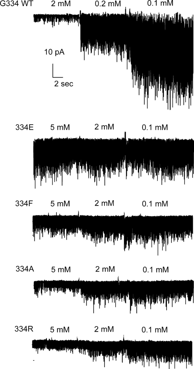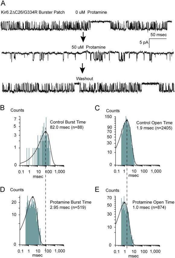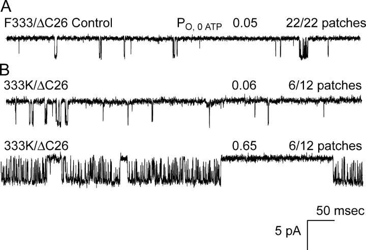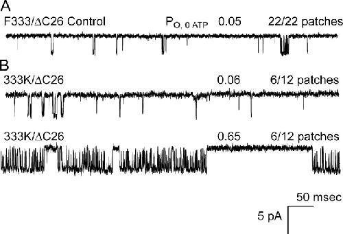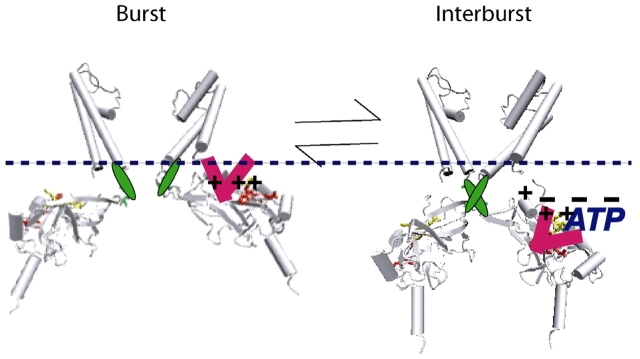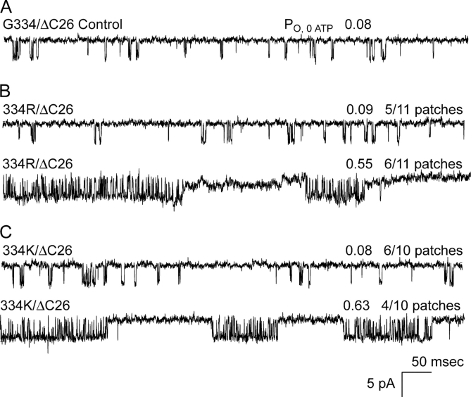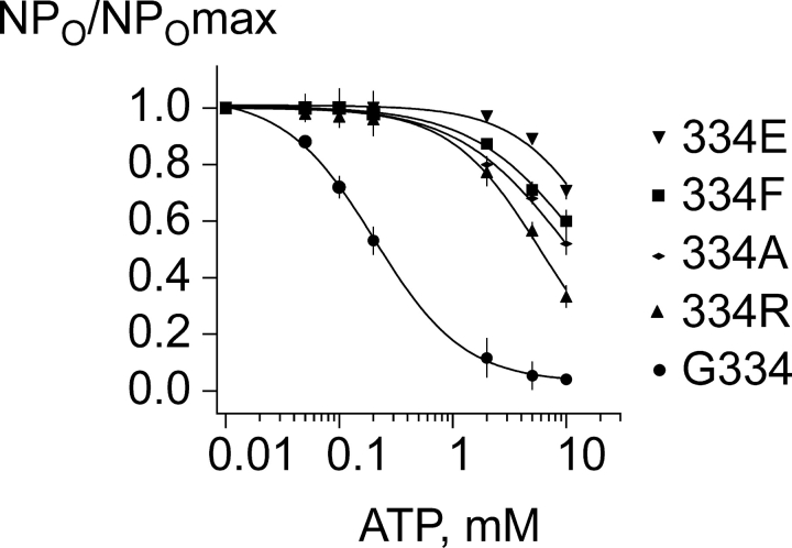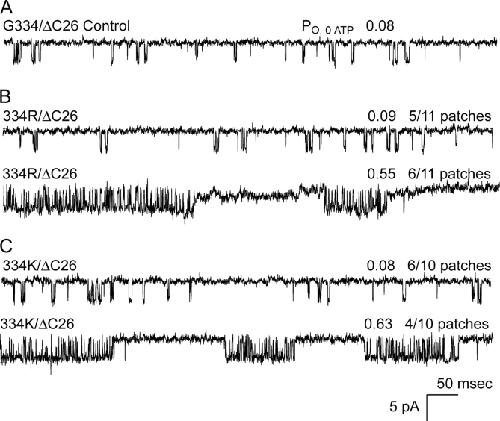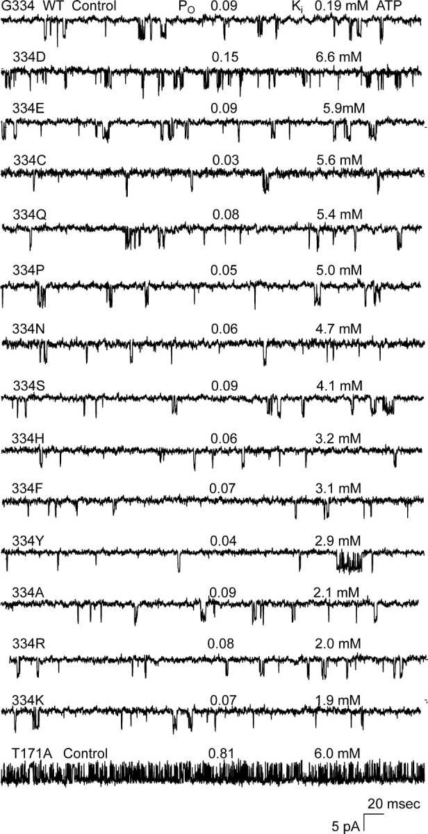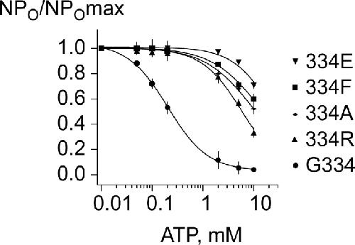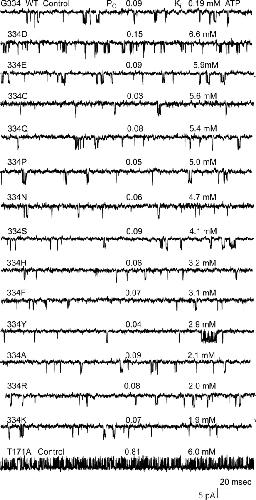 Major advances have been made on the inhibition gate and ATP site of the K(ir)6.2 subunit of the K(ATP) channel, but little is known about conformational coupling between the two. ATP site mutations dramatically disrupt ATP-dependent gating without effect on ligand-independent gating, observed as interconversions between active burst and inactive interburst conformations in the absence of ATP. This suggests that linkage between site and gate is conditionally dependent on ATP occupancy. We studied all substitutions at position 334 of the ATP site in K(ir)6.2deltaC26 that express in Xenopus oocytes. All substitutions disrupted ATP-dependent gating by 10-fold or more. Only positive-charged arginine or lysine at 334, however, slowed ligand-independent gating from the burst, and this was in some but not all patches. Moreover, the polycationic peptide protamine reversed the slowed gating from the burst of 334R mutant channels, and speeded the slow gating from the burst of wild-type SUR1/K(ir)6.2 in the absence of ATP. Our results support a two-step ligand-dependent linkage mechanism for K(ir)6.2 channels in which ATP-occupied sites function to electrostatically dissociate COOH-terminal domains from the membrane, then as in all K(ir) channels, free COOH-terminal domains and inner M2 helices transit to a lower energy state for gate closure.