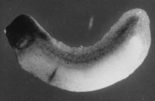 plug is totally negative. 2: Dorsal view of a neurula (St. 18) labelled with XL75 probe. XL75 mRNA is localized in the neurectoderm and neural
