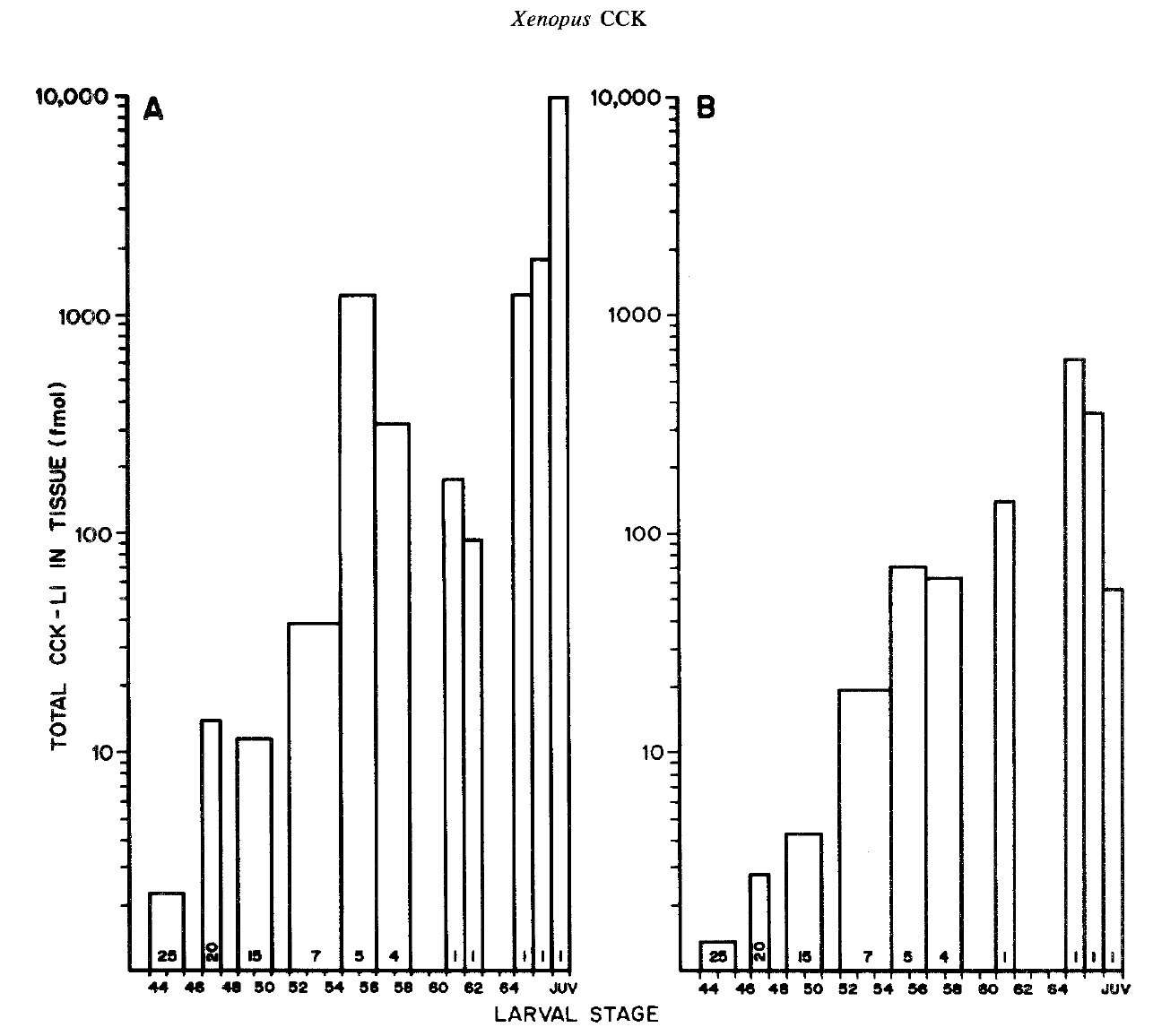 Cholecystokinin (CCK) radioimmunoassay and immunocytochemistry were used to localize the expression of CCK-like peptides in the gut, brain, and skin of Xenopus laevis during development from fertilization through metamorphosis to the adult form. CCK-like peptides were first detected in the gut shortly before food was first observed in the lumen of the intestine. This CCK-like immunoreactivity (CCK-li) was localized in endocrine cells in the duodenal mucosa. Gut CCK-li decreased during metamorphosis coincident with gut histolysis. After metamorphosis, gut CCK-li appeared in the newly organized gastric antrum at Nieuwkoop-Faber stage 62-63 and reappeared in the reconstituted duodenum at stage 63-64. In both cases, CCK-li was localized in endocrine cells. In both the gastric antrum and the duodenum, the first appearance of CCK-li preceded the functional activity of its target tissues. CCK-li increased in the brain during brain primary differentiation and again during metamorphic climax coincidentally with the differentiation of the hypothalamo-hypophysial system. Brain CCK-li then declined during the transition from larva to adult. We conclude that the first presence of food in the lumen of the larval gut does not induce the appearance of CCK-li and that CCK may play a role in regulating the development of the gastrointestinal tract and brain in X. laevis.