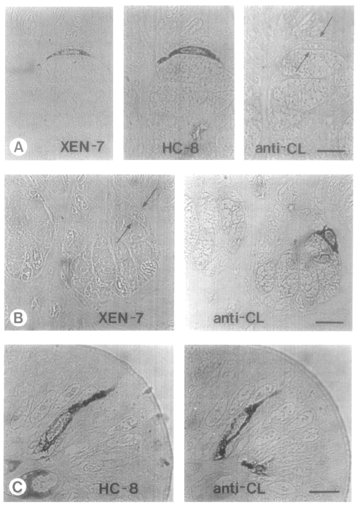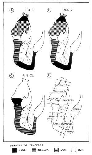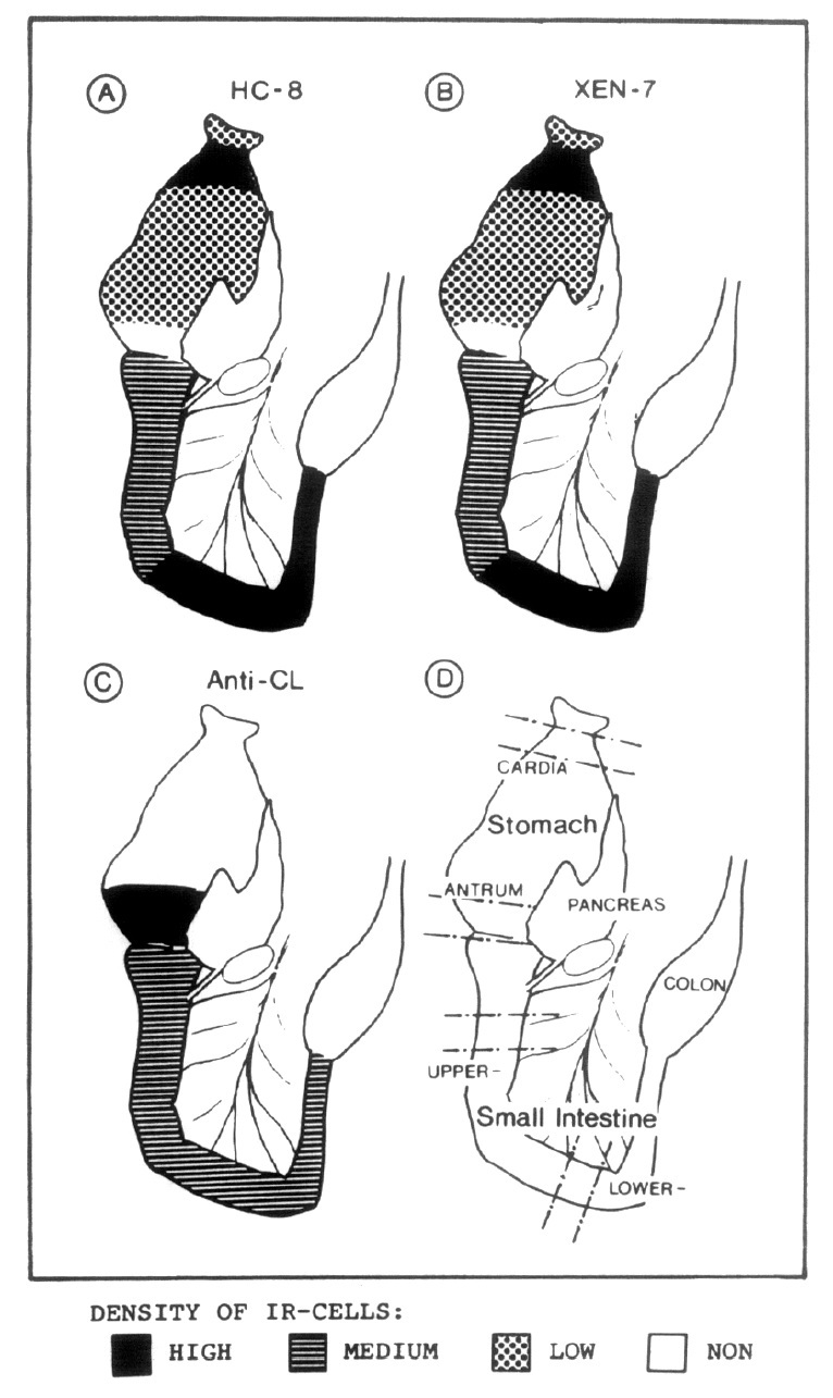 Distribution and association of neurotensin (NT)- and xenopsin (XP)-like peptides were investigated using immunocytochemical techniques in the amphibian gut. Antisera against both groups of peptides showed an identical distribution pattern of NT- and XP-positive cells in Xenopus laevis gastrointestinal tract. Immunolabeling of consecutive semithin sections revealed the coexistence of NT- and XP-like substances within cells of the stomach and small intestine. Recent reports of the colocalization of XP-like material with gastrin in mammalian G cells led us to study the association of NT/XP-like peptides with members of the gastrin/cholecystokinin (CCK)/caerulein (G/C) family in amphibians. The data obtained from immunolabeling serial sections with NT/XP-specific and G/C-specific antisera show that in some intestine NT/XP- and G/C-like peptides do exist in the same cells. In the stomach, however, G/C-like material is confined to endocrine cells of the antral region, while NT/XP-like substances occur in distinct cells accumulating in cardial glands but absent in the pyloric glands. Our findings thus indicate that in amphibian gastrointestinal tract there is some association between the regulatory peptide families NT/XP and G/C, similar to mammals. The regional distribution of both hormone families, however, is different from that in mammals.