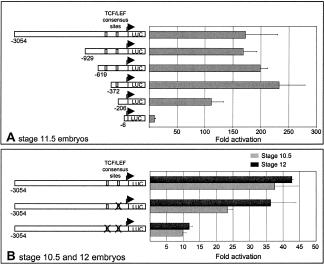 XTcf-3 functions as a transcriptional regulator in the canonical Wnt signaling cascade and can repress or activate downstream target genes. Expression of XTcf-3 is differentially regulated in time and place during development (Molenaar et al. [1998] Mech Dev. 75:151-154), but little is known about the mechanisms that control transcriptional activation and repression. A 15-kb genomic fragment of Tcf-3 sequences from Xenopus tropicalis was cloned, including the 5' untranslated region; exons 1, 2, and 3; and intron sequences. We used 5' deletion constructs for transgenesis and episomal luciferase assays in Xenopus to examine temporal and spatial regulation of the promoter during early development. A -3054/+34-bp Tcf-3 upstream region was identified that drives a green fluorescent protein (GFP) reporter transgene in a pattern similar to endogenous expression of XtTcf-3 from gastrula to tail bud stages. At stage 12, expression of the reporter is restricted to the middle and posterior neurectoderm. At stage 22, expression is strongest in the neural plate, the eye anlagen and branchial arches. At stage 35/36, expression is found in the head mesenchyme, the branchial arches, the heart, the mesencephalon, eyes, otic vesicles, notochord, somites and the lateral plate mesoderm. Part of the cis-acting elements driving this GFP reporter transgene expression map between -372 and -95 bp of the transcription start site. Furthermore, two TCF/LEF sites are necessary for full activity of the promoter during gastrula stages in episomal luciferase assays.