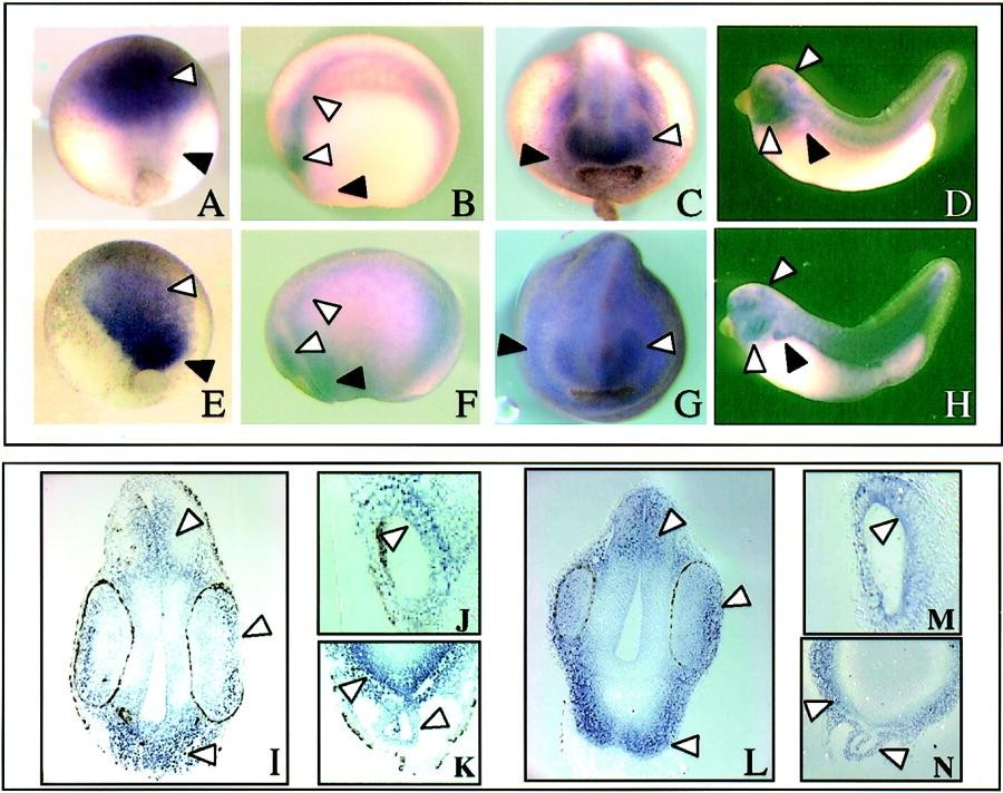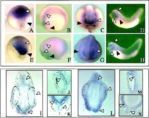 Figure 2. Expression of the (-3054/+71)-XtTcf-3::GFP reporter in transgenic X. laevis embryos. A-H: Transcripts of the green fluorescent protein (GFP) reporter (E-H) or endogenous XlTcf-3 (A-D) were detected by whole-mount in situ hybridization with GFP or XlTcf-3 antisense RNA probes, respectively. The expression pattern of the XtTcf-3::GFP transgene overlapping that of endogenous XTcf-3 is indicated by white arrowheads; differences in expression levels are indicated by black arrowheads (for further details see text). I-N: Sections of stage 36 embryos (I-K for endogenous XTcf-3, L-N for transgene expression). Arrowheads in I and L indicate endogenous and transgene expression in the (sub)ependymal layer of the mesencephalon, in the eye, and headmesenchyme. Arrowheads in J and M indicate expression in the epithelium of the otic vesicle. Arrowheads in K and N indicate expression in the lateral plate mesoderm and in the myocardium and endocardium.