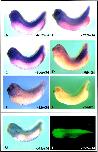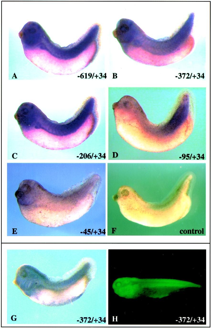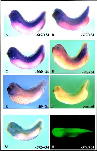 Figure 4. Deletion analysis of the XTcf-3 promoter in representative transient transgenic Xenopus laevis. A series of 5 prime deletion constructs was analyzed for green fluorescent protein (GFP) expression in situ. A-C: The expression pattern of the GFP transgenes -619/+34::GFP (A), -372/+34::GFP (B), and -206/+34::GFP (C) is similar to that of the endogenous Tcf-3 expression at stage 35/36 with expression found in specific parts of the brain, including the mesencephalon, eyes, headmesenchyme, branchial arches, heart, otic vesicles, notochord, somites, and lateral plate mesoderm. D: The -95/+34::GFP construct showed only some expression around the eye and tail bud but none of the other structures. E: Further delineation of the construct to -45/+34 bp showed similar loss of expression (for further details, see text and Table 1). F: As a control, in situ hybridization of wild-type embryos with GFP-AS probe showed no staining after 2 days of incubation. G: A representative X. tropicalis transgenic embryo displays an expression pattern of the -372/+34::GFP transgene comparable to its expression in transgenic X. laevis, although expression in the ventral area appears higher and more extended. H: This expression is lost at stage 40. Results indicate that transcriptional regulation of XtTcf-3 is similar in both Xenopus species and that X. laevis can be used for transient analysis of regulatory sequences.