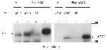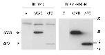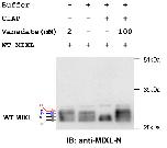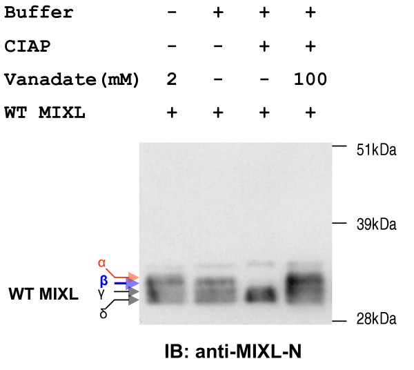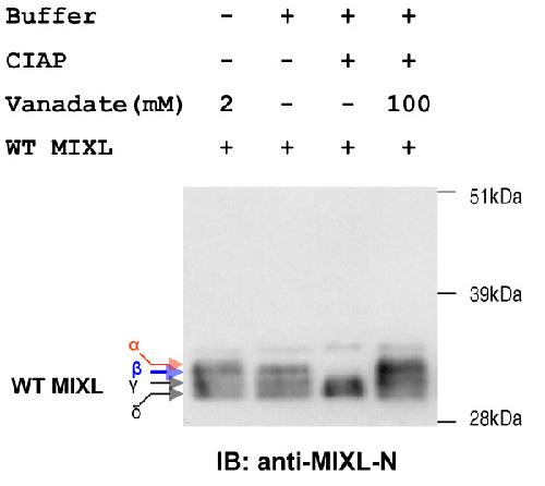 Figure 1. Alkaline Phosphatase treatment of nuclear extracts alters the mobility of MIXL1 proteins on SDS-PAGE gel. Expression plasmid pCMV5-MIXL1 was transiently transfected to HEK 293T cells and the transfectants were harvested 60 hours later. 15ug of fresh nuclear extracts were treated with 40u calf intestine alkaline phosphatase (CIAP) in the absence or presence of phosphatase inhibitor sodium orthovanadate at 30°C for 15 min. After CIAP treatment, nuclear extracts with orthovanadate and CIAP reactions were resolved on a NuPAGE gel and transferred to a PVDF membrane. Immunobloting was done with anti-MIXL1-N (1:350 dilution). Anti-MIXL1-N detected 4 species on lane 1 (nuclear extracts with orthovanadate and no CIAP treatment). The band α disappeared on mock reaction (lane 2). CIAP treatment resulted in disappearance of both band α and β (lane 3). In contrast, the addition of phosphatase inhibitor orthovanadate protected the all the 4 species (lane 4).