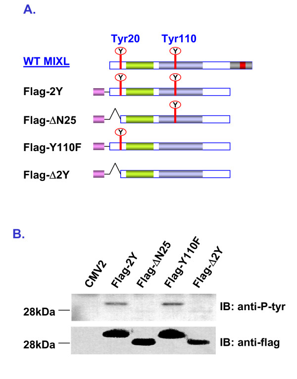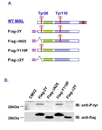 Figure 4. MIXL1 is phosphorylated on Tyr20. A) Cartoon depicting MIXL1 constructs generated for mutational analysis. Three MIXL1 mutant constructs were derived from the ΔCAD mutant construct pCMV2-flag-ΔCAD (renamed as Flag-2Y in this figure). Each mutant in the constructs has a Flag epitope (a solid gray bar) attached in frame to the amino-terminus and contains either tyr20 or tyr110 or none as illustrated. B) Detection of tyrosine phosphorylation. The mutant constructs were transiently transfected into HEK 293T cells. 10 μg of nuclear proteins from the transfectants were resolved on a NuPAGE gel. Tyrosine phosphorylation was examined by immunobloting with monoclonal antibody 4G10 (1:3000). The blot was stripped and re-probed with mouse monoclonal antibody anti-flag (1:300). Tyrosine phosphorylation was detected in both the mutant Flag-2Y and the mutant Flag-Y110F but not in the mutant Flag-ΔN25 as well as the mutant Flag-Δ2Y. The results are consistent with Tyr20 being the target of phosphorylation.
