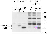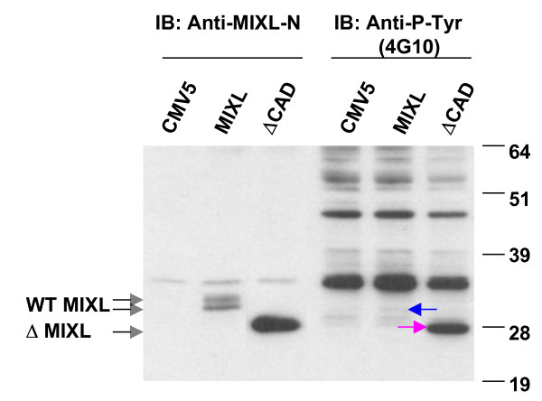Figure 2. MIXL1 is phosphorylated on tyrosine residues. Nuclear proteins were extracted from 293T cells transiently transfected with constructs pCMV5-MIXL1 and pCMV5-ΔCAD. Equal amounts of nuclear extracts (10 μg for CMV5 control and MIXL1 and 5 μg for ΔCAD) were loaded in duplicate into a NuPAGE gel and transferred to PVDF membranes. The blot was divided into two halves and hybridized with either anti-MIXL1-N (1:100) or anti-P-Tyr (mouse monoclonal antibody 4G10 at 1:4000). Anti-MIXL1-N antibody detected two species in transfectants expressing full-length MIXL1 and a strong fuzzy band in transfectants expressing the C-terminal truncation. The second half of the blot probed with 4G10 detected a weak but specific signal (arrow) corresponding to the slower migrating form of full-length MIXL1 and a robust signal (arrow) for the C-terminal truncation.