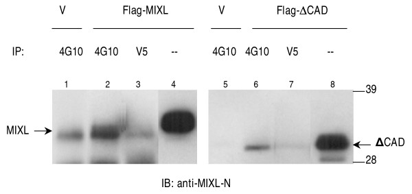 Figure 3. Immunoprecipitation of phosphorylated MIXL1 by anti-phosphotyrosine antibody 4G10. Expression constructs pCMV2-flag-MIXL1 and pCMV2-flag-ΔCAD were transfected into HEK 293T cells. 500 μL of nuclear proteins (1μg/μL) from the transfected cells were precleared with 50 μL protein-A-agarose bead slurry (50%v/v) and incubated with 5 μg of the phosphotyrosine-specific antibody 4G10 or the antibody anti-V5 as an isotypic control overnight. The immune complexes were precipitated with 60 μL protein-A-agarose bead slurry (50%v/v). Washed pellets were dissociated and resolved in a NuPAGE gel for immunobloting with the antibody anti-MIXL1-N (1:500). The immunoprecipitation and immunobloting for full-length MIXL1 is shown in the left panel, while mutant ΔCAD in the right panel. A small fraction of both full-length MIXL1 and mutant ΔCAD were immunoprecipitated with the antibody 4G10 (Lane 2 or 6) but not with an isotypic control antibody anti-V5 (Lane 3, or 7). Supernatants from the immunoprecipitation reactions denoted by (-) show the integrity of proteins. A strong band below full-length MIXL1 appeared to be non-specific, as it was also present in the controls. The blot on the left (lanes 1, 2, 3) was exposed to a Kodak film for 30 seconds, while the blot on the right (lanes 4, 5, 6) was exposed for only 5 seconds.