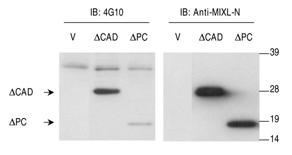 Figure 5. Tyr20 phosphorylation is diminished in the absence of PRD. The constructs pCMV5-ΔCAD and pCMV5-ΔPC (lacking both the CAD and PRD) were transfected into HEK 293T cells. 15 μg of the nuclear extracts from the transfectants were resolved on a 10% NuPAGE gel. Tyrosine phosphorylation was detected by immunobloting with monoclonal antibody 4G10. The same blot was stripped and reprobed with anti-MIXL1-N antibody (1:400). Compared to the vector control, the antibody 4G10 detected a weak signal for the ΔPC mutant, although it is much weaker than that for ΔCAD mutant with the intact PRD domain. V-Vector.