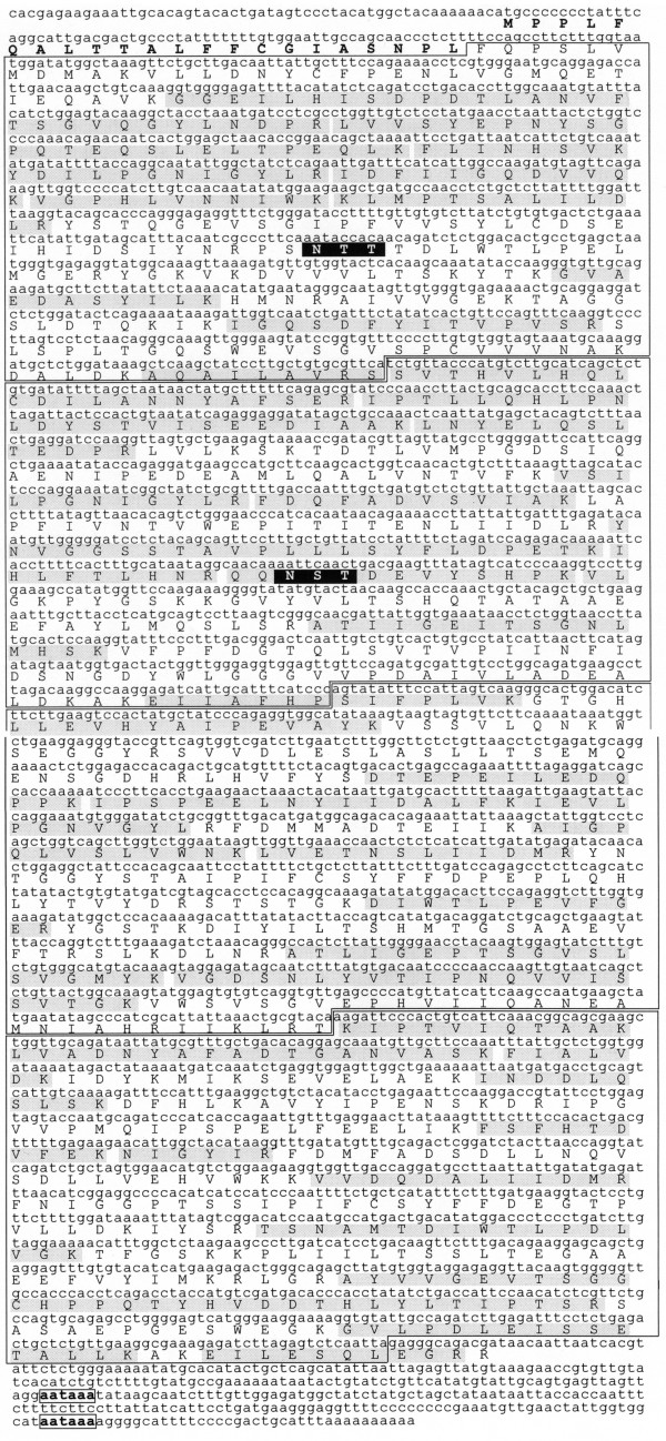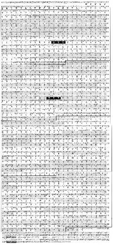 Figure 2. Translated amino acid sequence of Xenopus IRBP. The first 22 amino acid residues (bold) comprise the signal sequence. The four homologous modules of the protein are boxed. The black boxes with white text are glycosylation consensus sequences. The shaded regions are segments of the recombinant protein that were verified by LC-MS/MS. The 3'-UTR contains two polyadenylation signal sequences (boxed and in bold). This cDNA sequence is available through the European Bioinformatics Information, Genbank and DDBJ Nucleotide Sequence databases under accession number X95473 and sequence identification XLIRBP.