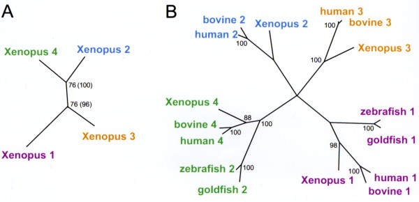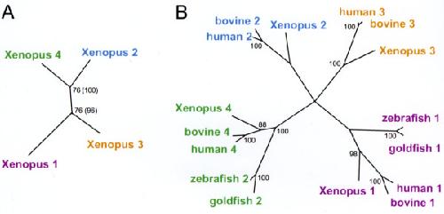 Figure 3. Comparison of Xenopus IRBP with itself and known IRBPs. A) Dotplot of Xenopus IRBP, comparing the protein sequence against itself. The boxes on the ordinate and abscissa are schematic diagrams of modules 1 through 4. The numbering on the axes correspond with the amino acid residues in Figure 2. The diagonal lines indicate regions of internal similarity, and hence the presence of the four modules. B) Distance tree showing the relationship between Xenopus, human, bovine, goldfish and zebrafish IRBPs. The branch lengths are drawn to scale and the values at the nodes indicate the number of times a grouping occurred in a set of 100 bootstrap values. The long distance separating the teleosts from amphibians is due in part to the teleosts having only two modules.