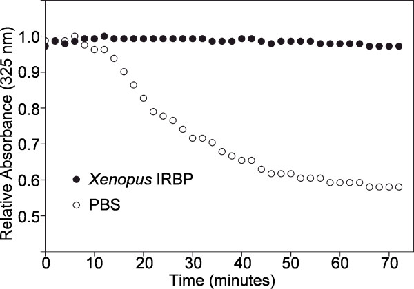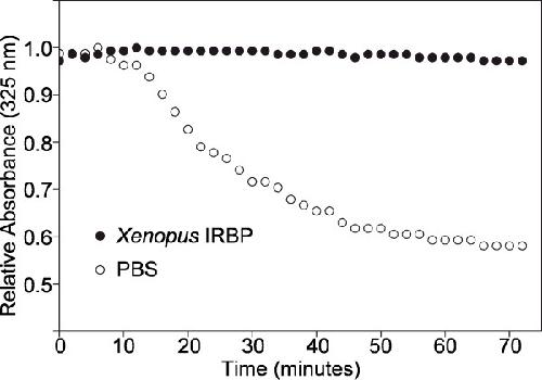 Figure 6. Protection of all-trans retinol by full-length Xenopus IRBP. Three μl of an ethanolic solution of all-trans retinol was added to 400 μl of 2.7 μM full-length Xenopus IRBP in PBS. The final concentration of all-trans retinol in solution was 3.2 μM. The degradation of all-trans retinol was monitored by measuring its absorbance at 325 nm as a function of time. For each sample, absorbance measurements were made every 2 min for 72 minutes. Full-length Xenopus IRBP (filled circles) is able to protect all-trans retinol from degradation as compared to a PBS control (unfilled circles).