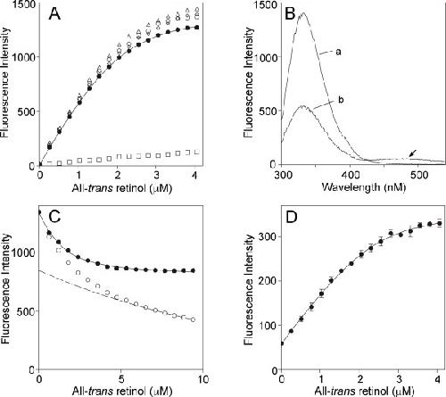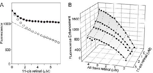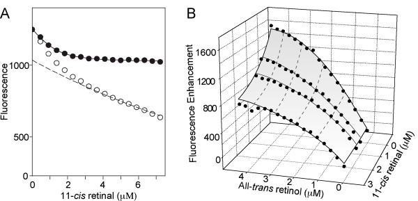 Figure 8. 11-cis retinaldehyde binding to full-length Xenopus IRBP. Since retinaldehydes are nonfluorescent compounds their binding cannot be followed by ligand fluorescence enhancement or energy transfer. Here, the binding of 11-cis retinaldehyde is followed by monitoring quenching of endogenous protein fluorescence, and indirectly by competition with the efficient fluorophore all-trans retinol. A) Representative titrations monitoring quenching of intrinsic protein fluorescence by bound 11-cis retinaldehyde. Excitation and emission wavelengths were 280 and 340 nm, respectively. The inner filter effect was accounted for by graphical correction as previously described [56] (-●-, before correction for inner filter effect; -●-, after correction). The binding parameters were calculated to be: N = 1.81 ± 0.15; Kd11-cis = 0.28 ± 0.05 μM. B. Representative competition titration. From each titration the emission of an 0.D.280 matched solution of N-acetyl-L-tryptophanamide was subtracted. Binding parameters: N = 3.53 ± 0.19 with Kdall-trans = 0.22 ± 0.13 μM; Kd11-cis = 0.21 ± 0.10 μM.