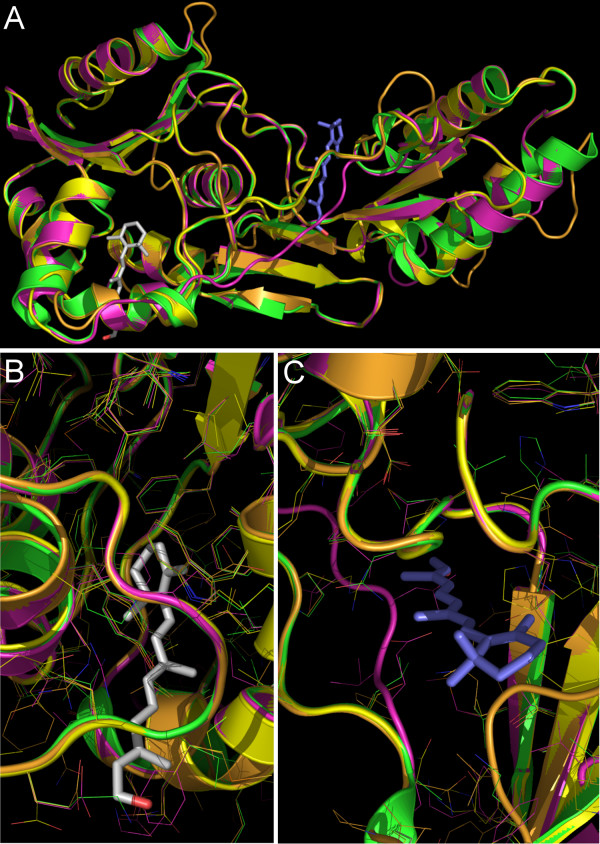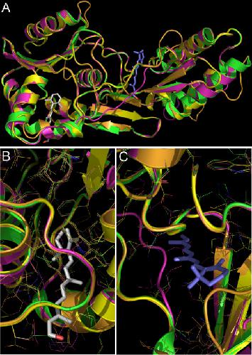Figure 11. Homology modeling of the modules of Xenopus IRBP. A) Superimposition of the predicted structures of X1-, X3- and X4IRBPs with the X-ray crystal structure of X2IRBP. Ribbon diagram: X1IRBP, orange; X2IRBP, green; X3IRBP, magenta; X4IRBP, yellow. Molecular docking studies predict two binding sites for all-trans retinol. The best scoring poses for the conformational search are shown with the retinol molecule colored grey in site I, and blue in site II. Close-up views of the docked all-trans retinol molecule in (B) site I, and (C) site II. All side chains are shown by thin lines in the colors of the backbones. The amino acid residues within contact distances to the ligand are tabulated in Table 5.