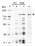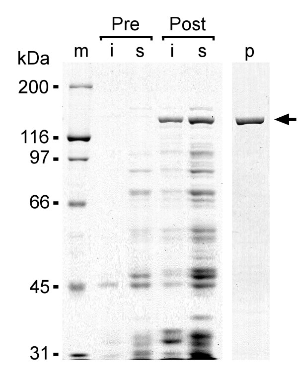 Figure 5. Expression and purification of full-length Xenopus IRBP expressed in E. coli as a soluble thioredoxin/histidine-patch fusion protein (arrow). Coomassie blue stained 8% polyacrylamide gels, showing over expression of the recombinant IRBP. m = molecular weight markers; i = insoluble fraction; s = soluble fraction; Pre and Post refer to the bacterial fractions before and after induction with IPTG; p = purified protein.