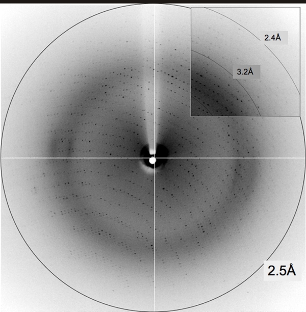 Figure 4. An X-ray diffraction pattern from a Xenopus interphotoreceptor retinol-binding protein crystal recorded at the A-1 station of the Cornell High Energy Synchrotron Source. The detector was at a distance 250 mm; the wavelength, the oscillation angle and the exposure time were 0.978 Å, 1°, and 15 s, respectively. The right upper corner segment is shown in higher contrast to demonstrate the limiting resolution of diffraction of ~2.45 Å.