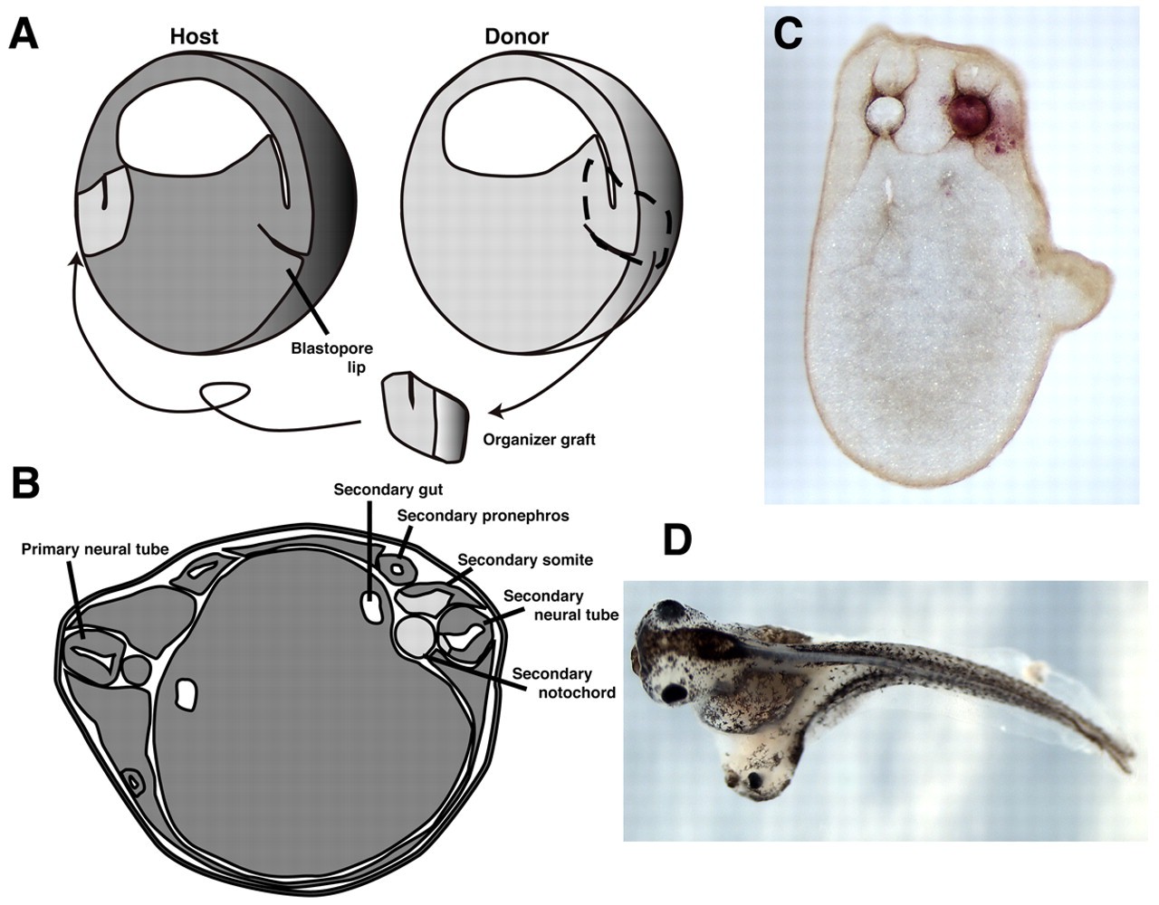 Fig. 1. Organizer grafts result in induction of a secondary axis. (A) Schematic of the organizer graft created by Spemann and Mangold, using a light-gray newt donor (Triturus cristatus) grafted into a dark-gray host (Triturus taeniatus). The gastrulae are shown in hemisection for illustrative purposes only (dorsal is towards the right, and the dimensions of these embryos are more Xenopus-like than Triturus-like). (B) The famous result of an optimal grafting experiment (Spemann and Mangold, 1924), showing a section through the trunk of a twinned embryo. The light-gray graft has contributed to the notochord, medialsomite and floor plate of the secondary axis. The graft has an induced neural tube, somites, a pronephros and a secondary archenteron cavity. (C, D) Contemporary organizer grafts from Andrea E. Wills (UC Berkeley, CA, USA). (C) The section shows a rafted organizer labeled with lacZ mRNA and stained with Red-Gal; the section is taken through the trunk of a stage 28 Xenopus laevis embryo, where the axial tissues are also stained with Tor70 antibody. (D) Twinned Xenopus embryo, resulting from an organizer graft carried out at stage 10.