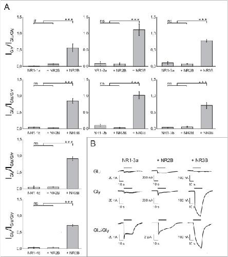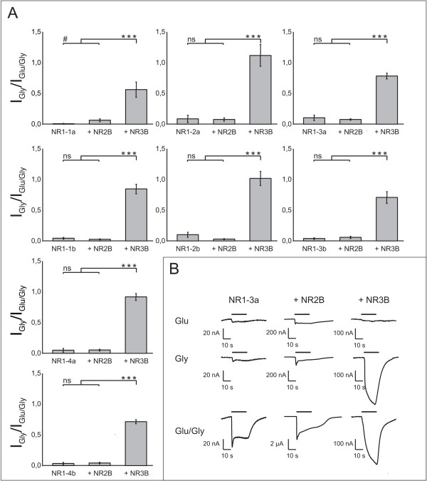 Figure 1. Comparison of agonist-induced currents for all NR1 splice variant/NR3B combinations. A. Ratio of current responses elicited by application of glycine (10 μM, Gly) and glycine plus glutamate (300 μM, Glu) for NR1 subunits expressed alone, NR1/NR2B heteromers, and NR1/NR3B heteromers. Data shown here are mean values ± SEM, n = 10–23 from 2–5 independent experiments per combination; *p < 0.05; **p < 0.01; ***p < 0.005 (Student's t-test). B. Representative current traces of diheteromers, shown exemplary for combinations with NR1–3a. Black bars denote agonist application.