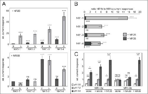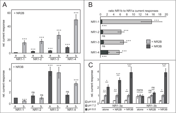 Figure 2. Comparison of glutamate/glycine-induced steady-state current amplitudes for all NR1 isoforms with either NR2B or NR3B. A. Relative current responses for each of the eight NR1 splice variants coexpressed with NR2B (upper panel) or NR3B (lower panel). Amplitudes were normalized to the responses mediated by NR1-1a/NR2B and NR1-1a/NR3B, respectively. All currents were recorded after the application of 300 μM glutamate and 10 μM glycine. Data shown here are mean values ± Gaussian error propagation, n = 6–10 from 2 independent experiments per combination. B. Current potentiation by the N-terminal NR1b splice variants over NR1a variants when coexpressed with either NR2B (light grey) or NR3B (dark grey). Responses of the NR1a variants were independently set to 1 and responses mediated by NR1b variants were normalized to the responses of the respective NR1a variants. Data are mean values ± Gaussian error propagation, n = 6–10 from 2 independent experiments per combination. ns = not significant. C. Relative glutamate/glycine-induced current responses of NR1–3a- and NR1–3b-containing NMDARs depending on the pH value. Current responses were normalized to the values measured at pH 7.2. Data are mean values ± Gaussian error propagation, n = 6. alone = expressed alone; ns = not significant.