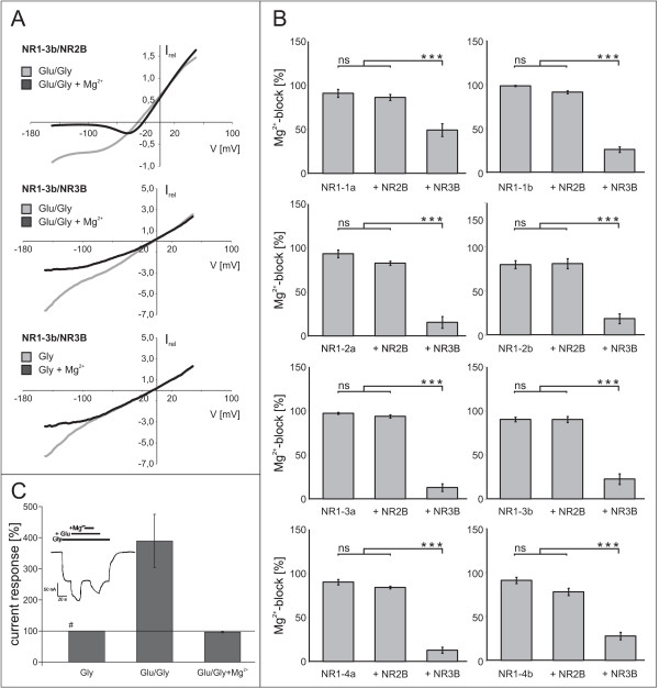 Figure 3. Comparison of the Mg2+ block of NR3B-containing diheteromers with each of the NR1 splice variants. A. Current-voltage (IV) relationships for NR1–3b/NR2B (upper diagram, Glu/Gly-induced currents) and NR1–3b/NR3B (middle and lower diagrams for Glu/Gly- and Gly-induced currents, respectively) recorded between -150 mV and +50 mV. Recordings were performed in the presence of 300 μM glutamate (Glu) and/or 10 μM glycine (Gly) in the presence (dark grey traces) and absence (light grey traces) of 0.5 mM Mg2+. Traces represent averages from 4 experiments per combination (normalized to +20 mV). B. Comparison of the Mg2+ block of agonist-evoked current responses at -70 mV for each NR1 splice variant expressed alone, with NR2B, or with NR3B. Mean values ± SEM, n = 9–18 from 2–5 independent experiments per combination; *p < 0.05; **p < 0.01; ***p < 0.005 (Student's t-test). C. Exemplary potentiation by glutamate of glycine-induced NR1–3b/NR3B receptor currents in oocytes with high expression levels of XenNR2B. Note that only the portion of current induced by additional glutamate is blocked by Mg2+. Current responses are mean values ± SEM normalized to the glycine-induced response (set to 100% and marked with #), n = 6. The inset shows a representative current trace from this batch recorded during sequential applications of agonists and Mg2+.