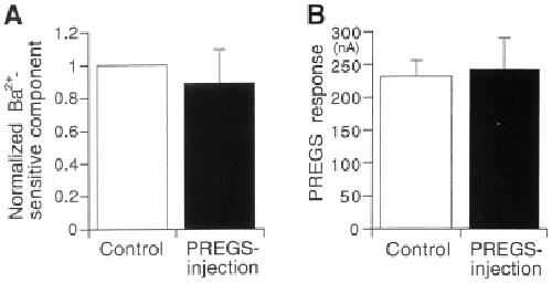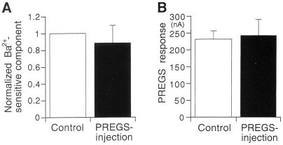 Figure 3. Effect of intracellular PREGS in Xenopus oocytes expressing Kir2.3 channels.(A) Comparison of basal Kir2.3 currents before and after PREGS injection in oocytes expressing Kir2.3 channels. The amplitude of Kir2.3 currents was normalized to the amplitude of 3 mM Ba2+-sensitive current components before PREGS injection. (B) Comparison of 50 µM PREGS-induced Kir2.3 currents before and after PREGS injection. Data are expressed as mean±SEM.