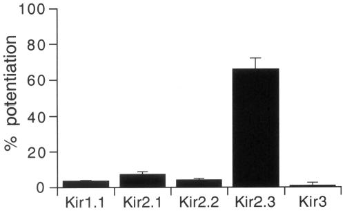 Figure 6. Comparison of the effects of PREGS on Kir1.1, Kir2.1, Kir2.2, Kir2.3, and Kir3 channels expressed in Xenopus oocytes.The magnitudes of change in Kir currents by 100 µM PREGS were normalized to the 3 mM Ba2+-sensitive current components. For Kir3 channels, oocytes expressing brain-type Kir3.1/Kir3.2 channels were used. Current responses were measured at a membrane potential of −70 mV in an hK solution containing 96 mM K+. Data are expressed as mean±SEM.