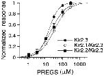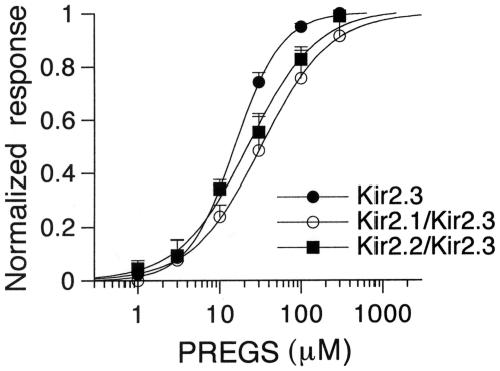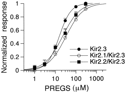 Figure 7. Comparison of the potentiation effects of PREGS on Kir2.3, Kir2.1/Kir2.3, and Kir2.2/Kir2.3 channels expressed in Xenopus oocytes.Responses to PREGS at different concentrations were normalized to the maximal response to PREGS. Current responses were measured at a membrane potential of −70 mV. Data are expressed as mean±SEM.