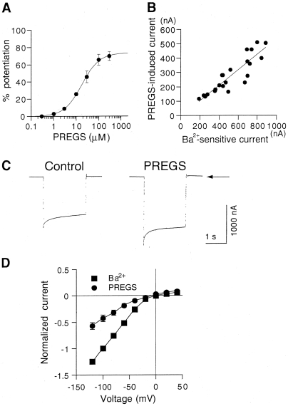 Figure 2. Characteristics of Kir2.3 channel potentiation by PREGS.(A) Concentration-dependent effect of PREGS on Kir2.3 channels. The magnitudes of Kir2.3 currents potentiated by PREGS were normalized to the 3 mM Ba2+-sensitive current components in Xenopus oocytes expressing Kir2.3 channels (554.0±79.9 nA, n = 6). Data are expressed as mean±SEM of the percentage responses. (B) Correlation between amplitudes of current response to 30 µM PREGS and amplitudes of the 3 mM Ba2+-sensitive current components in oocytes expressing Kir2.3 channels. The correlation coefficient was 0.894 (P<0.05, n = 22, regression analysis). Current responses were measured at a membrane potential of −70 mV in an hK solution containing 96 mM K+. (C) Representative Kir2.3 currents elicited by a voltage step to −100 mV for 2 s from a holding potential of 0 mV in the presence or absence of 30 µM PREGS in an oocyte injected with Kir2.3 mRNA. Arrow indicates the zero current level. (D) Current-voltage relationships of 3 mM Ba2+-sensitive currents and 30 µM PREGS-enhanced currents in oocytes expressing Kir2.3 channels. Current responses were normalized to the 3 mM Ba2+-sensitive current component measured at a membrane potential of −100 mV (1510.0±209.9 nA, n = 6).