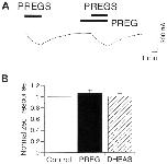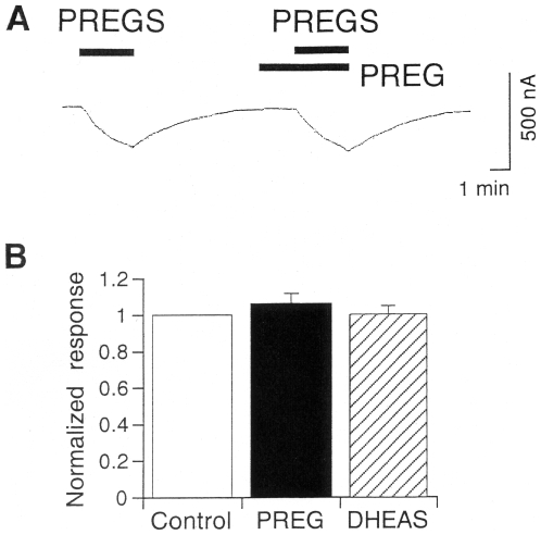 Figure 4. Effects of PREG and DHEAS on PREGS-induced Kir2.3 currents.(A) Representative current responses to 30 µM PREGS and to 30 µM PREGS in the presence of 100 µM PREG in a Xenopus oocyte expressing Kir2.3 channels. Current responses were measured at a membrane potential of −70 mV in an hK solution containing 96 mM K+. (B) Comparison of PREGS-induced Kir2.3 currents in the presence or absence of PREG or DHEAS. Concentrations of PREGS, PREG, and DHEAS were 30, 100, and 100 µM, respectively. Current responses to PREGS in the presence of PREG or DHEAS were normalized to the amplitude of PREGS-induced currents in the absence of PREG or DHEAS (control). Data are expressed as mean±SEM.