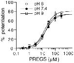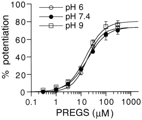 Figure 5. Concentration-response relationships for potentiation of Kir2.3 channels by PREGS at different pH values.The magnitudes of potentiation of Kir2.3 currents by PREGS in oocytes expressing Kir2.3 channels were normalized to the 3 mM Ba2+-sensitive current components, which were 426.9.6±41.4 nA (pH 6.0), 554.0±79.9 nA (pH 7.4) and 729.2±36.6 nA (pH 9.0). The EC50 and nH values were 16.1±1.2 µM and 1.44±0.07 (pH 6.0, n = 10), 15.6±0.9 µM and 1.43±0.03 (pH 7.4, n = 6), and 17.1±1.5 µM and 0.70±0.03 (pH 9.0, n = 8), respectively. Current responses were measured at a membrane potential of −70 mV in an hK solution containing 96 mM K+. Data are expressed as mean±SEM of the percentage responses.