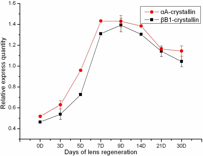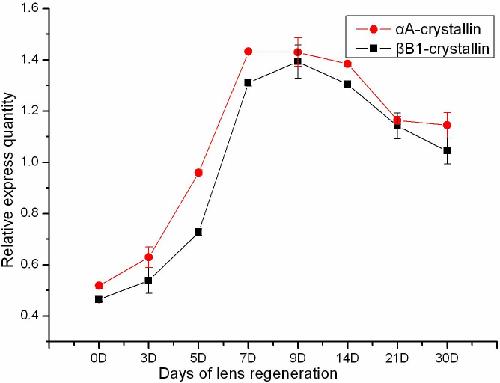 Figure 3. Real time PCR analysis for transcripts of αA-crystallin and βB1-crystallin during lens regeneration. The eyeballs of regenerated lenses were dissected at pre-operation, 0 day, 3 days, 5 days, 7 days, 9 days, 14 days, 21 days, and 30 days after lentectomy. The transcripts of two crystallins showed the same variation trends.
