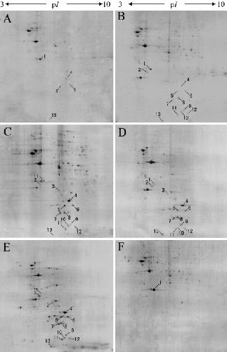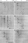 Figure 6. Two-dimensional electrophoresis photography of regenerated lens. A-F: The patterns of protein spots in regenerated lens (5 days, 7 days, 9 days, 11 days, 15 days, 0 day, respectively). The protein patterns are significantly different among all stages of regeneration. Although differences existed, some protein spots just showed the variation of expression quantity.
