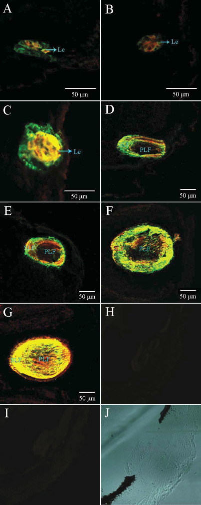 Figure 5. Immunofluorescence for αA-crystallin and βB1-crystallin during the lens regeneration. The images show the distribution of αA-crystallin and βB1-crystallin in the process of the regeneration, analyzed by confocal microscopy. The regenerated lenses were dissected at operation: 3 days, 5 days, 7 days, 9 days, 11 days, 15 days, and 21 days, as is shown in A-G, respectively. Negative controls: H (only primary antibodies); I (only secondary antibodies); J: differential interference contrast (DIC). Abbreviations: Le, lens; PLF, primary lens fiber; SLF, secondary lens fiber.