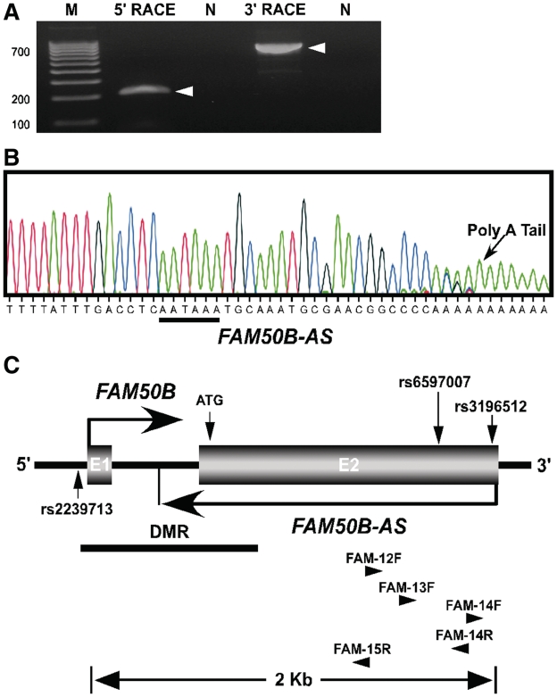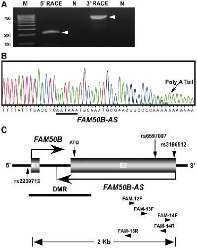 Figure 1. Genomic map of human FAM50B locus. (A) FAM50B-AS RACE-PCR showing a 211 bp product of 5′-RACE and an 823 bp product of 3′-RACE. M, 100 bp DNA ladder. N, control reactions were performed using cDNA prepared in the absence of primers to eliminate the possibility of genomic DNA and RNA contamination. (B) Sequencing of 3′-RACE-PCR demonstrates the polyA sequence and AAUAAA motif (underlined) of FAM50B-AS. (C) The FAM50B locus spans 2 kb of genomic sequence at chromosome 6p25 and consists of two exons (E1 and E2). Horizontal arrows indicate the sense (FAM50B) and antisense (FAM50B-AS) transcripts of the gene. FAM50B-AS originates at the 3′-end of FAM50B and terminates within FAM50B intron 1. The black horizontal line indicates the position of the DMR. Vertical arrows designate positions of SNPs rs2239713 (C/T), rs6597007 (G/C), rs3196512 (G/C) and the translational start codon ATG. The position and direction of primers used for RACE is indicated by horizontal arrowheads. Primer sequences are provided in Supplementary Table S1.