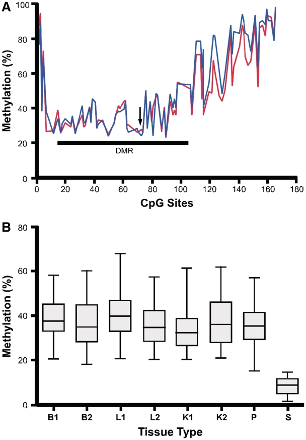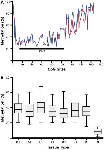 Figure 2. CpG methylation status at the FAM50B locus. (A) The percent methylation of CpG sites 1–166 was quantified by Sequenom MassARRAY using DNA from conceptus liver (blue line, n = 3) and brain (red line, n = 3). CpG site numbers correspond to the positions within the GC rich region (−1353 to +1066 relative to the FAM50B translational start codon). Arrow indicates the position of the translational start codon. The location of a DMR is shown by a horizontal line. (B) Average methylation of CpG sites (12 to 110) does not vary significantly for conceptus tissues from the three germ layers and from different gestational ages, while sperm shows low levels of methylation at this locus. B, brain; L, liver; K, kidney; P, placenta; S, sperm; B1, L1 and K1—gestational age of 81 days; B2, L2 and K2—gestational age of 110 days.