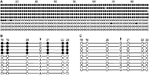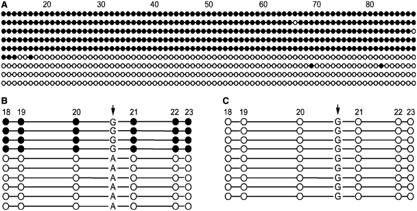 Figure 3. Allele-specific methylation at the FAM50B locus. (A) Clones obtained from bisulfite-treated conceptus liver DNA are either predominantly methylated or unmethylated from the 18th CpG site to the 66th CpG site. (B) Clones obtained from bisulfite-treated conceptus liver DNA, representing one of three individuals heterozygous for SNP rs2239713 (arrow), while their matched maternal deciduae are homozygous G/G for the SNP sites. The allele-specific distribution of methylation with respect to the G/A polymorphism demonstrates that the maternally-derived allele is methylated while the paternally derived allele is unmethylated. (C) Clones obtained from bisulfite-treated mature sperm DNA are completely unmethylated. CpG sites are represented by circles. Unfilled circle, unmethylated CpG site; filled circle, methylated CpG site.