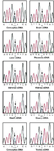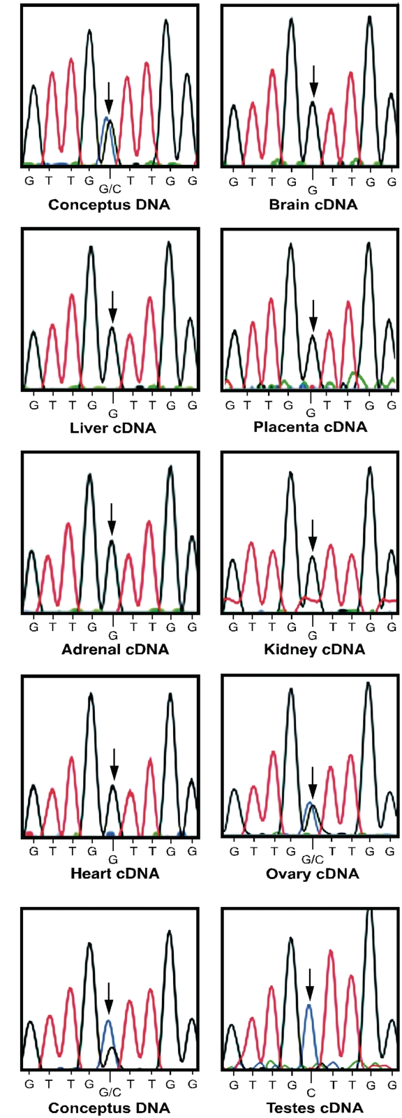 Figure 4. Imprinting analysis of human FAM50B. Genomic DNA from human conceptuses (A and B) is heterozygous for polymorphism rs6597007 (G/C). Sequencing of cDNA demonstrates monoallelic expression of FAM50B transcripts in multiple conceptus tissues, including brain, liver, placenta, adrenal gland, kidney, heart and testis. In contrast, FAM50B expression is biallelic in fetal ovary. The position of SNP rs6597007 used to determine allelic expression is indicated by the arrows.
