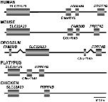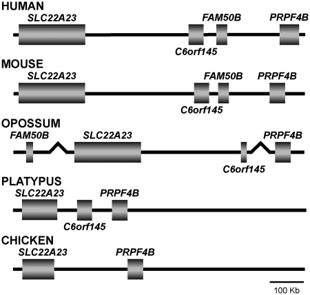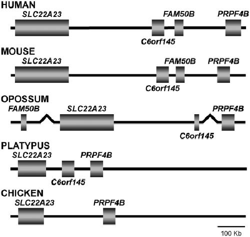 Figure 5. Phylogenetic comparison of the genomic structure of FAM50B and flanking genes. FAM50B is flanked by C6orf145 and PRPF4B in human (chromosome 6) and mouse (chromosome 13), but is 78 Mb upstream from the SLC22A23 ortholog in the opossum (chromosome 3). FAM50B orthologs are not present in the platypus (UltraContig Ultra 352) and chicken genomes (chromosome 2).