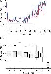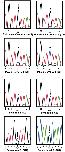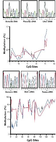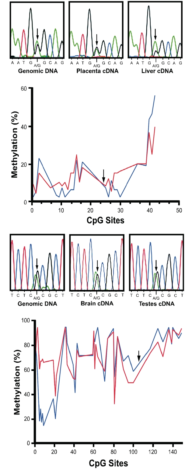 Figure 6. Imprinting analysis of FAM50B in the opossum and the mouse. (A) cDNA sequencing demonstrates biallelic expression of FAM50B in opossum placenta and liver. Arrows indicate the position of the SNP used to determine the allelic expression patterns. (B) Methylation at CpG dinucleotides is <20% for most of the region that encompasses the opossum FAM50B translational start codon, from −340 to 972 bp. Blue line, DNA from liver; red line, DNA from kidney. Arrow indicates the position of the translational start codon. (C) FAM50B cDNA sequencing demonstrates biallelic expression of the FAM50B in mouse brain and testis. Arrows indicate the position of the SNP used to determine the allelic expression patterns. (D) Methylation is >60% at most CpG sites in proximity to the translational start codon of murine FAM50B (from −8800 to 1120 bp relative to translational start codon). Arrow indicates the position of the translational start codon. Blue line, DNA from kidney; red line, DNA from liver.