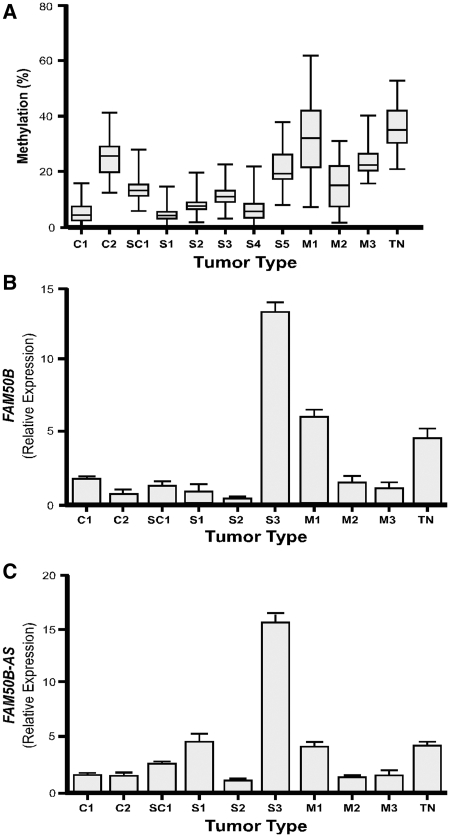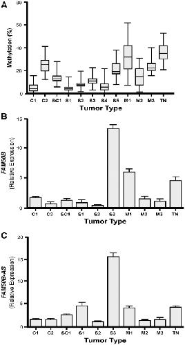 Figure 7. Methylation status and gene expression of FAM50B locus in TGCTs. (A) Percent methylation of the FAM50B DMR in each tumor and in normal testis controls (n = 3). (B) Relative expression levels, normalized to GAPDH, of FAM50B transcripts in TGCTs and in normal testis controls (n = 3). (C) Relative expression levels, normalized to GAPDH, of the FAM50B-AS transcripts in TGCTs and in normal testis controls (n = 3). TGCTs include: embryonic carcinoma (C1, C2), seminoma mixed with embryonic carcinoma (SC1), pure seminoma (S1, S2, S3 and S4, S5), and mixed germ cell tumor (M1, M2 and M3). Normal testis tissue (TN, n = 3) was used for comparison.