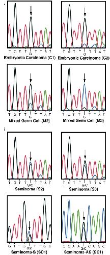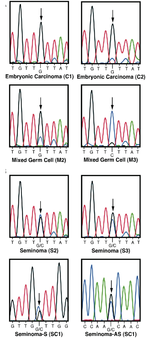 Figure 8. Allelic expression of FAM50B in TGCTs. (A) cDNA sequencing of TGCTs demonstrates maintenance of monoallelic expression of the FAM50B transcript in embryonic carcinoma C1 and C2 and mixed germ cell tumor M2 and M3. (B) cDNA sequencing of TGCTs demonstrates biallelic expression of the FAM50B transcripts in the seminomas S2 and S3 and biallelic expression of both FAM50B and FAM50B-AS in seminoma mixed with embryonic carcinoma SC1. The SNP rs3196512 (G/C) was used to determine allelic expression of FAM50B in sample C1, C2, M2, M3, S2 and S3. The SNP rs6597007 (G/C) was used to determine allelic expression of FAM50B and FAM50B-AS in sample SC1. The position of the SNP used to determine allelic expression is indicated by the arrows.