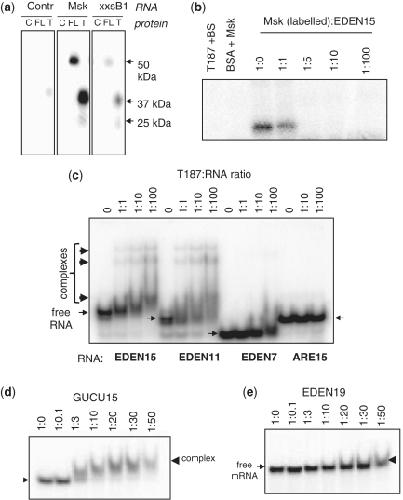 Figure 2. The first 187 amino acids of CELF1 are sufficient for specific binding to natural and synthetic binding sites. (a) UV-crosslinking of BSA control (C), full length CELF1 (FL), T353 (T) with radioactive maskin 3′-UTR (Msk), a truncated cyclinB1 3′-UTR (xxsB1) and a Control RNA (Bluescript polylinker transcript). Sizes of crosslinked bands are indicated. (b) UV-Crosslinking competition assay. The maskin 3′-UTR was competed with synthetic EDEN15. Radioactive control RNA (Bluescript: BS) or maskin 3′-UTR with EDEN15 in the indicated molar ratios were incubated with T187 and covalently crosslinked using by UV light. (c) Gel retardation assay with T187 EDEN15, EDEN11 and EDEN7, as well as with the AU rich element (ARE15) incubated in buffer A. An amount of 50 nM of RNA end labelled with γ-P32-ATP was incubated with increasing concentration of t187 protein, ratio RNA: protein from 1:0 to 1:100. Slender arrows indicate free RNA, thick arrows complexes induced by the protein. (d) Gel retardation of 45 nM GUCU15 with increasing concentrations of T187 in buffer B. (e) Gel retardation of 45 nM EDEN19 with increasing concentrations of T187 in buffer B.