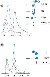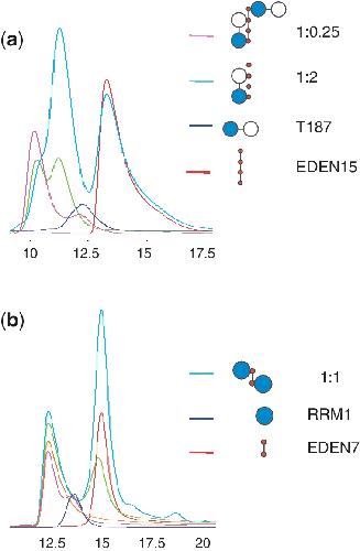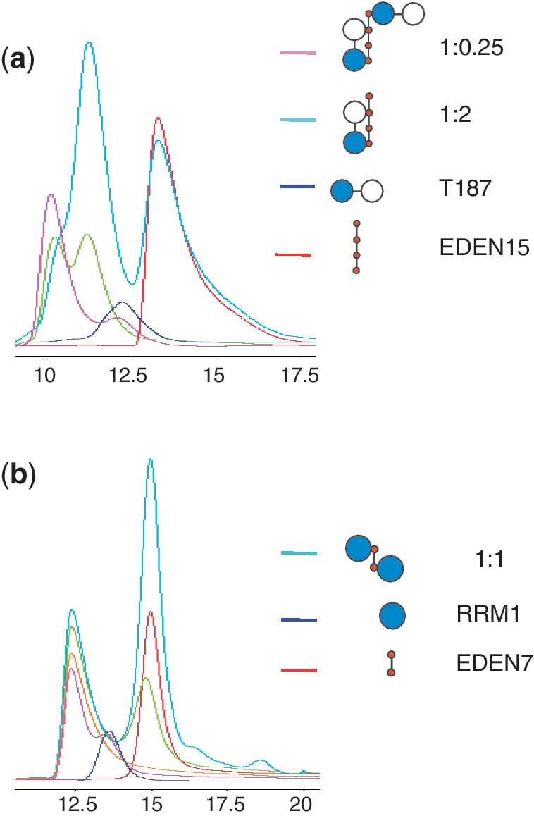 Figure 3. CELF1 RNA complex gel filtration profiles. (a) Plot of UV absorbance versus elution volume for T187 protein (blue) with RNA EDEN15 (red) mixed at two different molar ratios, 1:0.25 (pink); 1:1 (green), 1:2 (turquoise). (b) CELF1 RRM1 RNA complex gel filtration profiles. In blue RRM1 and in red EDEN7 alone. Different ratios RRM1:EDEN7: 1:0.25 (pink); 1:0.5 (orange); 1:1 (green) and 1:2 (turquoise).